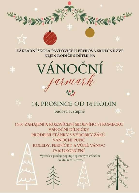 Základní škola zve na Vánoční jarmark, který se bude konat ve čtvrtek 14.12. v budově 1. stupně naší základní školy.Přijďte se potkat se známými, ochutnejte předvánoční atmosféru, vyrobte si něco hezkého v dílničce a podpořte nákupem výrobků žáků dobrou věc.Výtěžek poputuje opuštěným zvířatům do útulku v Přerově.Zahájení proběhne v 16 hodin před školou, kdy zazní koledy a slavnostně rozsvítíme školní vánoční stromeček. Těšit se můžete mimo jiné na vánoční pásmo 2. třídy, ukázku chemických pokusů v podání žáků 2. stupně a vánoční punč.